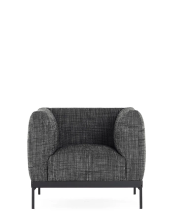 The design is distinguished by harmonious contrast between soft, comfortable cushions a precisely shaped metal frame, resembling a subtle tray. This lightweight, geometric base gives the sofas a unique character, making them fit perfectly into modern interiors, both private and commercial.