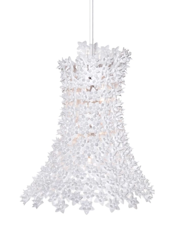 Bloom is a unique lamp that combines state-of-the-art manufacturing technology with a sophisticated, decorative design. Its design is based on a cylindrical polycarbonate frame, which is completely covered with intricately arranged double transparent flowers of the same material.