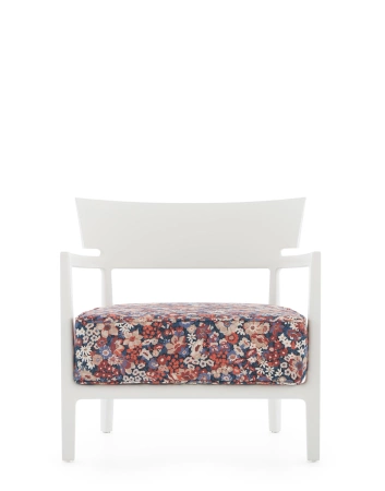 Plastics sofa, trix pouffe by Piero Lissoni and cara armchair designed by Philippe Starck get a new look by using liberty fabrics, specially designed for outdoor use. These innovative materials combine style and functionality, providing durability and resistance to weather conditions.