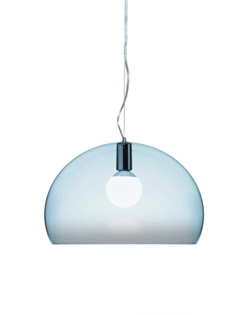 The FL/Y pendant lamp, designed by Ferruccio Laviani for Kartell, is modern lighting inspired by the form of a soap bubble. Its shade, made of transparent plastic, features a non-ideal hemispherical shape, with a cut edge below the diameter, allowing the light to be better focused directly below the lamp.