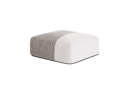 Handmade in India using a loom-weaving technique, the pouffe features a cover of 100% recycled PET fiber, recycled from consumer packaging. The material is as soft as wool, yet weatherproof, making it ideal for outdoor use. Fill is a gravidry® quick-drying foam, providing comfort and durability.