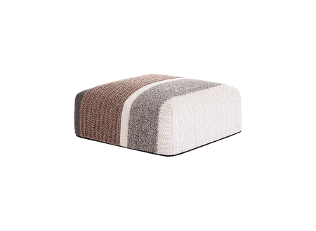 Handmade in India using a loom-weaving technique, the pouffe features a cover of 100% recycled PET fiber, recycled from consumer packaging. The material is as soft as wool, yet weatherproof, making it ideal for outdoor use. Fill is a gravidry® quick-drying foam, providing comfort and durability.