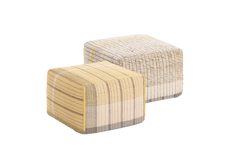Reversible pouffe brands GAN Rugs, designed by Charlotte Lancelot, is a unique piece of furniture that combines functionality with innovative design. Thanks to an innovative hand-weaving technique, the pouf has two distinct sides: one is made of 100% virgin wool, offering warmth and softness ideal for colder days, while the other is made of a blend of linen and cotton, providing lightness and breathability for the warmer months.