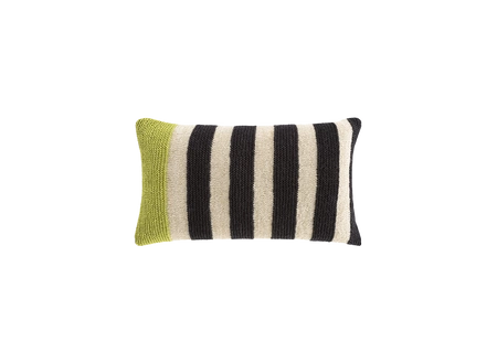 The pillow is available in two sizes: 70 x 40 cm and 64 x 64 cm, which allows it to fit different interior designs. It is available in two color versions: pistachio, with a dominant accent of green against a background of black and cream stripes, and black and white, with a geometric pattern in shades of black and white.