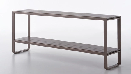 FLAT shelving unit 180 moves classic home bookcases outdoors with modern materials and high weather resistance. It is a garden rack made of sturdy panels and hand-welded aluminum profiles, available in various powder-coated colors. Shelves can be made of white, 100% recyclable polyethylene or ultra-durable material Dekton® by Cosentino - You decide.