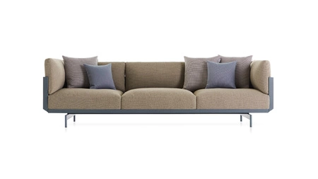 The base of this garden sofa is made of powder-coated aluminum and can be personalized with a special copper-colored leg finish. There is also a choice of color palettes suggested by Luca Nichetto and others available from GANDIABLASCO.