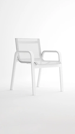 STACK dining club armchair is a garden furniture made of thermally varnished aluminum profiles. Its lightweight and subtle design gives the impression of floating above the ground, and the self-supporting fabric element perfectly matches the structure of the chair.