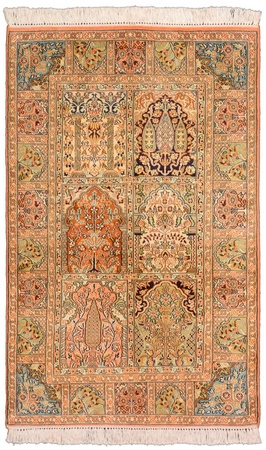 Our imported Kashmir Silk carpets are woven by hand using traditional techniques in Turkey and India . Designs are mostly Persian, in pastel colors. They are also characterized by a very fine weave and high quality materials used in their manufacture. Each carpet tells its own story: their colors have matured over decades. Despite the passage of time, they have not lost their intensity, but have only acquired the patina and character inherent in excellent handicrafts.
