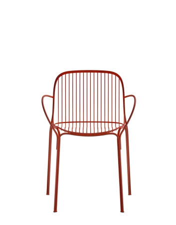 Thin metal rods form the lightweight, yet expressive forms, giving the collection a modern and subtle look. It includes HiRay enters: chair, chair with armrests, bistro table, armchair, sofa and side table - all available in colors white, maroon, black and green.