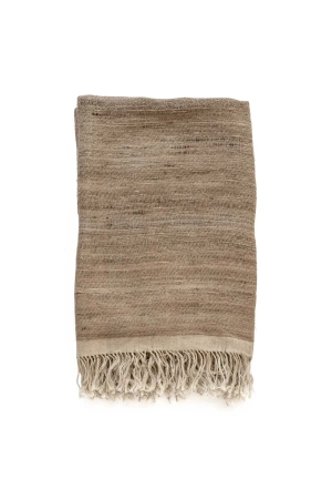 Pled is made of a blend of 55% linen and 45% silk, which gives it a unique texture and subtle shine. Hand weaving on a loom highlights craftsmanship and attention to detail. Natural color and raw fringed finish give it a rustic yet elegant feel.