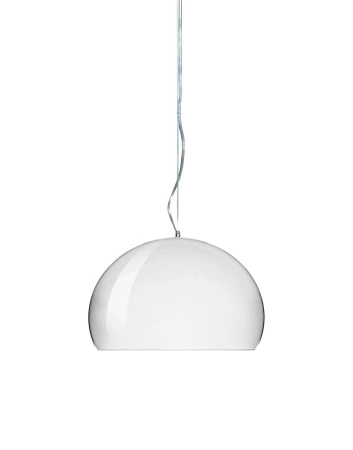 The FL/Y pendant lamp from Kartell, designed by Ferruccio Laviani, is a contemporary interpretation of classic lighting, inspired by the lightness of a soap bubble. Its transparent shade, available in a variety of colors, subtly reflects light, creating an iridescent shimmer effect.