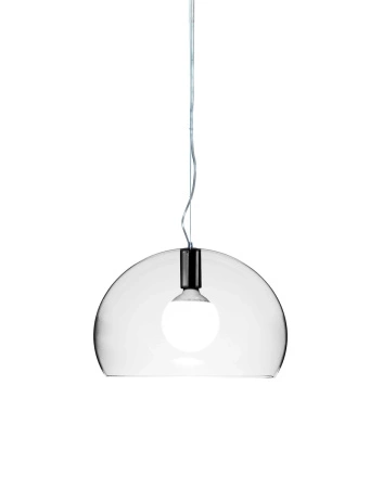 The FL/Y pendant lamp from Kartell, designed by Ferruccio Laviani, is a contemporary interpretation of classic lighting, inspired by the lightness of a soap bubble. Its transparent shade, available in a variety of colors, subtly reflects light, creating an iridescent shimmer effect.