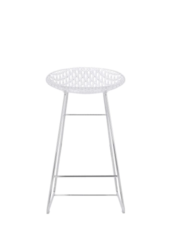 The seat is made of transparent or colored polycarbonate, which gives it visual lightness and unique aesthetics. The form of the stool imitates a fine metal mesh, creating a dynamic effect while maintaining durability and functionality.