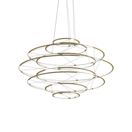 Lampa żyrandolowa o czystych, geometrycznych liniach została zestawiona z ultrasmukłą aluminiową konstrukcją, co pozwala uzyskać subtelne, lecz wyraziste wrażenie rozproszonego światła o łagodnym charakterze. Jej minimalistyczna forma nie dominuje wnętrza, lecz je dopełnia – oferując efektowne, a zarazem nienachalne źródło światła.