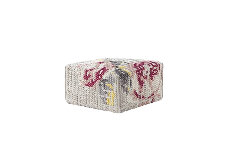 Pufa ma wymiary 60 x 60 x 35 cm, co czyni ją idealnym dodatkiem do salonu, sypialni czy przestrzeni wypoczynkowej. Dostępna jest w dwóch wersjach kolorystycznych: naturalnej, z delikatnymi odcieniami bieli, szarości, różu, czerwieni i żółci, oraz kolorowej, z dominującymi barwami turkusu i różu.