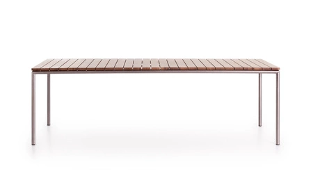 ONSEN dining table to designerski stół jadalniany z blatem wykonanym z ciepłych, drewnianych listew iroko oraz elegancką, jednolitą ramą ze stali nierdzewnej. Minimalistyczna forma i odkręcane nogi czynią z niego mebel wyjątkowo funkcjonalny i uniwersalny.