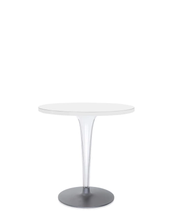 TopTop to linia stołów wyróżniająca się charakterystyczną nogą, która może mieć okrągły lub kwadratowy przekrój. Jej transparentna, wielopłaszczyznowa powierzchnia skrywa metalowy rdzeń, dodający całości elegancji i nowoczesnego charakteru.