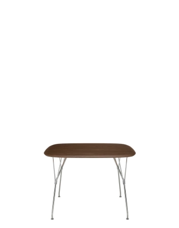 Modele kwadratowe i prostokątne, wsparte na czterech nogach, dostępne są w pięciu rozmiarach (100x100, 145x80, 160x90, 190x90 i 240x100 cm) oraz w trzech eleganckich wykończeniach blatu: jasny jesion z dwoma ciemniejszymi odcieniami, płomienisty orzech oraz wariant z cienkimi listwami w różnych tonach ciemnego drewna. Całość dopełniają nogi w wykończeniu chromowanym lub czarnym, nadające stołom nowoczesny i wyrafinowany wygląd.
